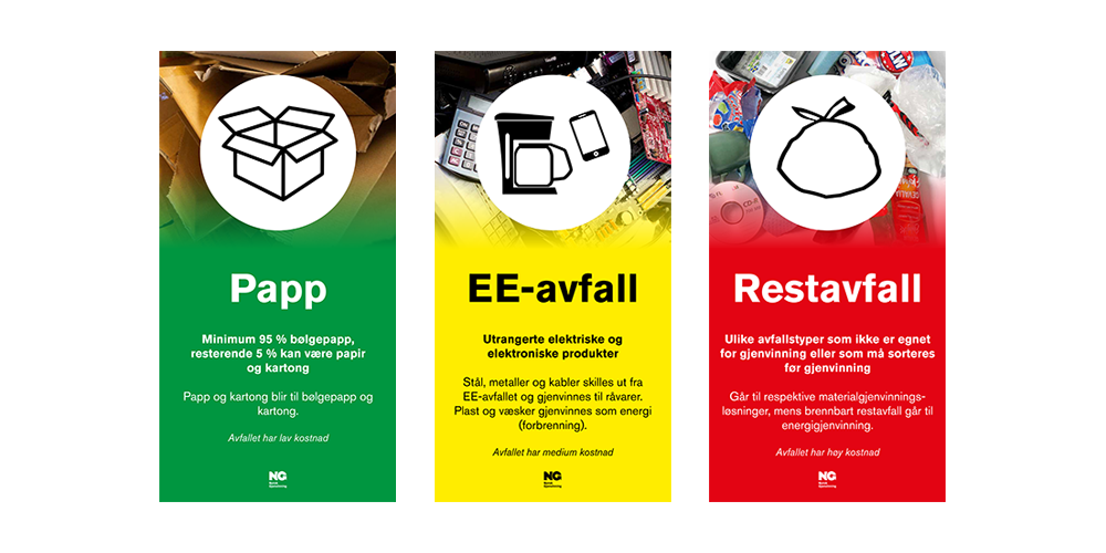 Lag klare, enkle regler for kildesorteringen og heng dem opp på veggen i avfallsrommet og andre steder hvor det kastes avfall. NG kan være behjelpelig med utforming av skilt og plakater.